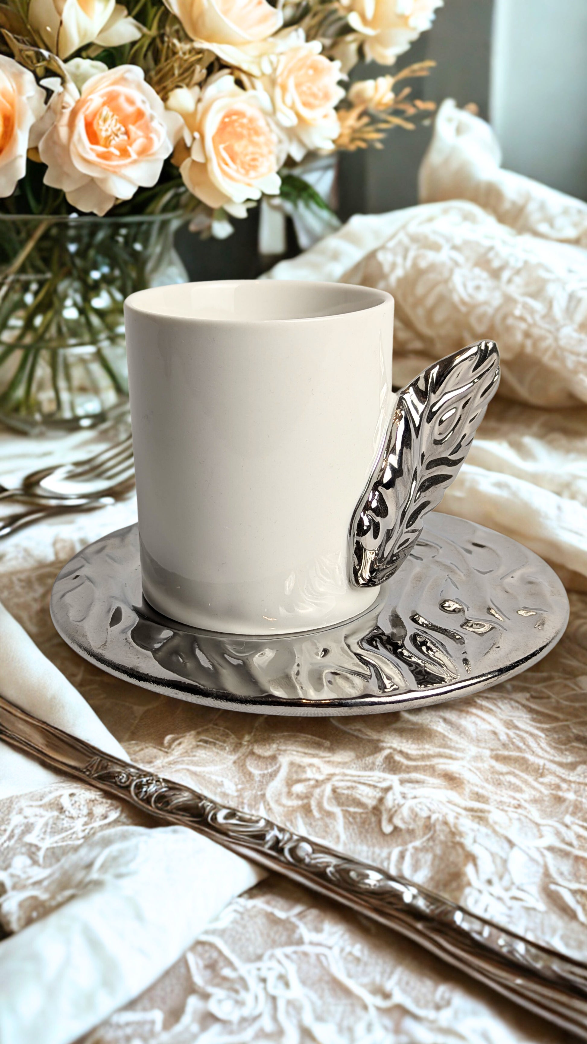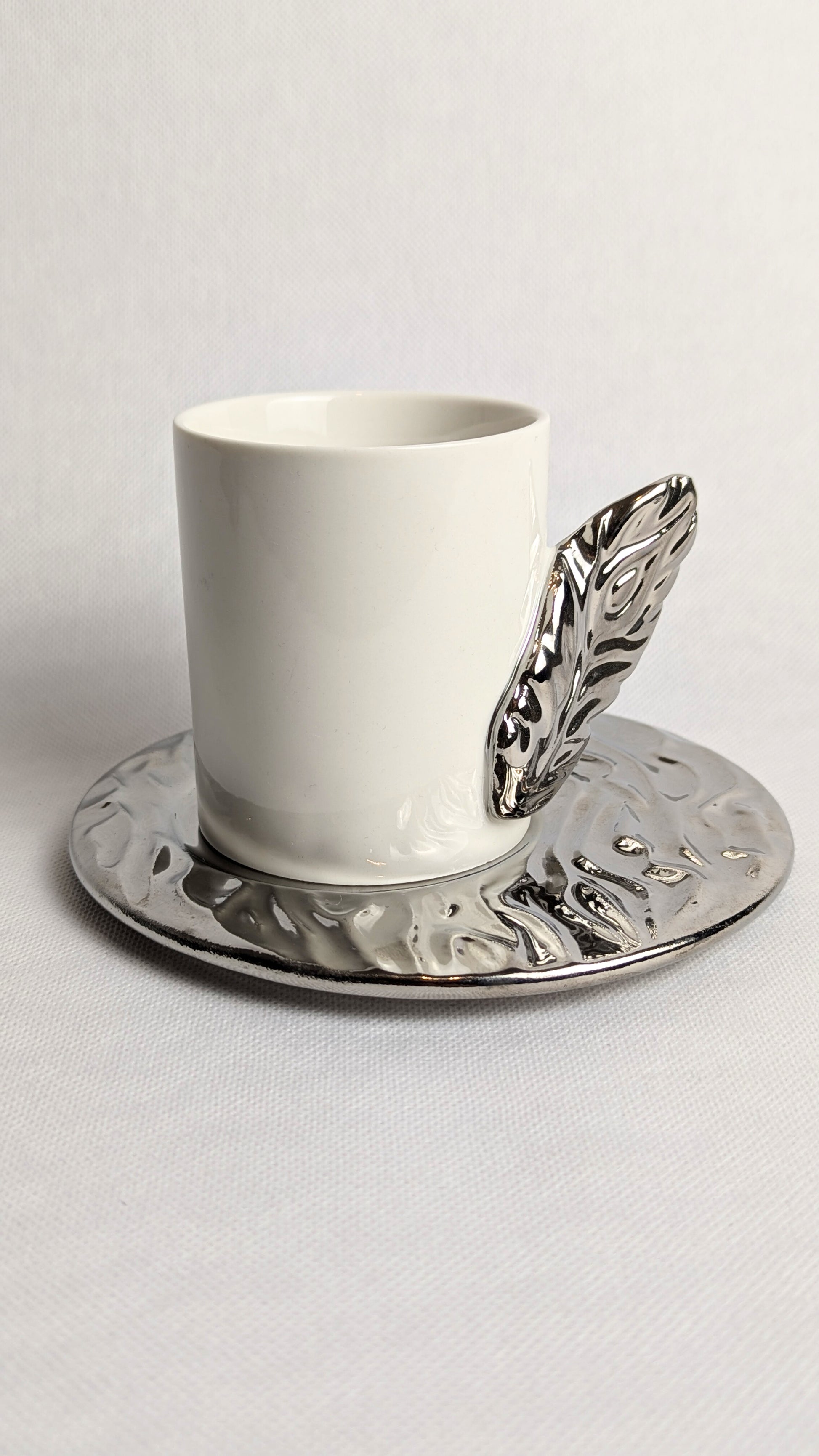 Découvrez ce set audacieux de 6 tasses à café, chacune ornée d'une poignée en forme de feuille argentée, qui apporte une touche d'élégance naturelle et moderne à votre pause café. Accompagnées de leurs sous-tasses assorties, ces tasses allient design unique et fonctionnalité, parfaites pour impressionner vos invités ou sublimer votre table. Offrez-vous une expérience café hors du commun avec ce service qui ose l’originalité et le raffinement.