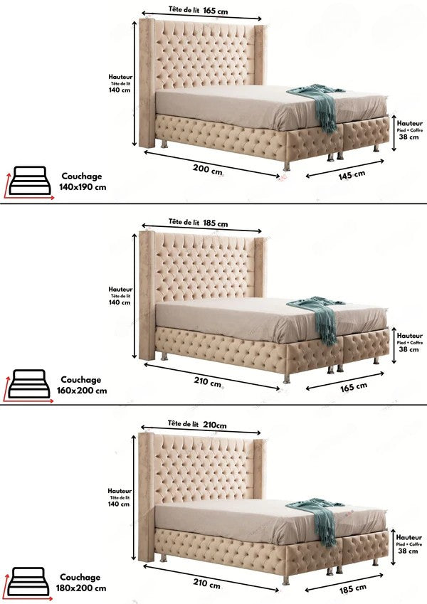 Apportez une touche de modernité et de raffinement à votre chambre avec le lit double coffre capitonné en velours signé Home de Luxe France. Revêtu d’un velours beige haut de gamme, il s’adapte à tous les styles d’intérieur : vintage, classique ou contemporain. Sa tête de lit cloutée et ses pieds en métal chromé lui donnent une allure royale et élégante. Pratique, son grand coffre intégré offre un espace de rangement idéal pour vos draps, plaids ou coussins. Disponible en trois dimensions, ce lit allie confort, style et fonctionnalité pour des nuits tout en douceur.