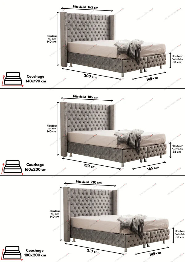 Apportez une touche de modernité et de raffinement à votre chambre avec le lit double coffre capitonné en velours signé Home de Luxe France. Revêtu d’un velours gris haut de gamme, il s’adapte à tous les styles d’intérieur : vintage, classique ou contemporain. Sa tête de lit cloutée et ses pieds en métal chromé lui donnent une allure royale et élégante. Pratique, son grand coffre intégré offre un espace de rangement idéal pour vos draps, plaids ou coussins. Disponible en trois dimensions, ce lit allie confort, style et fonctionnalité pour des nuits tout en douceur.