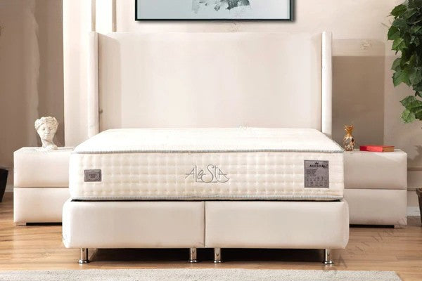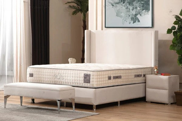 Sa structure métallique renforcée garantit une grande robustesse et une durabilité exceptionnelle, tandis que ses pieds chromés et sa tête de lit élégante apportent une finition soignée.