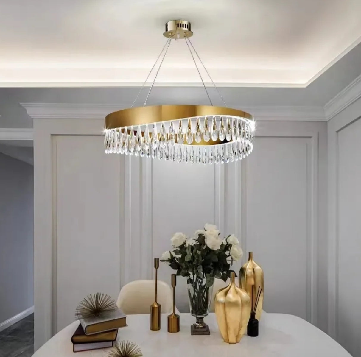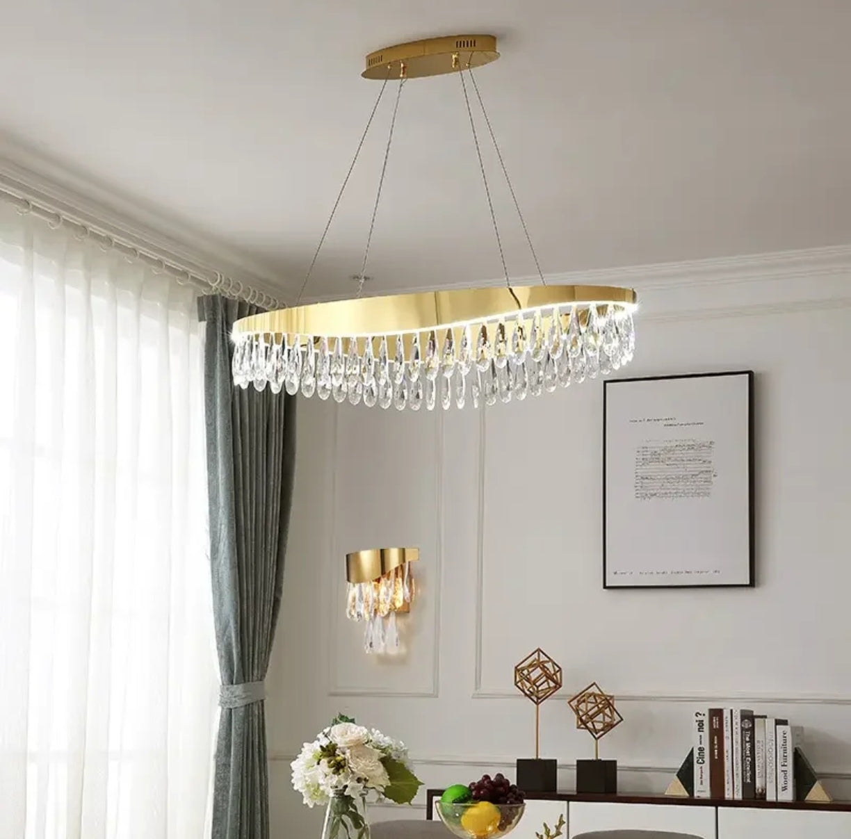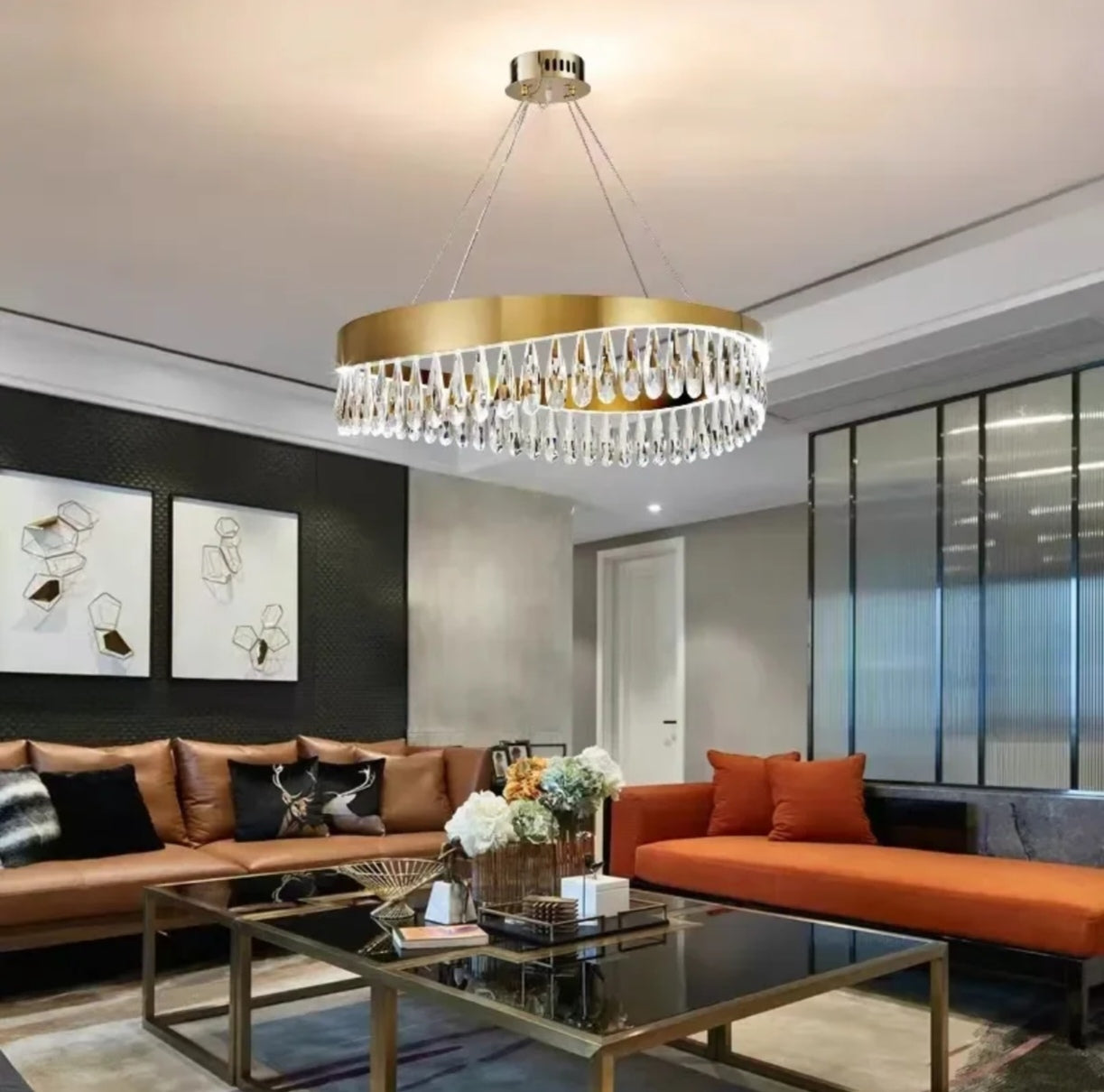Ajoutez une touche d’élégance à votre intérieur avec ce lustre rond à la finition dorée. Son design moderne est sublimé par de délicates pampilles en verre en forme de gouttes, qui reflètent joliment la lumière. Idéal pour sublimer un salon, une salle à manger ou une entrée, ce luminaire apporte un charme raffiné et une ambiance chaleureuse à votre pièce.