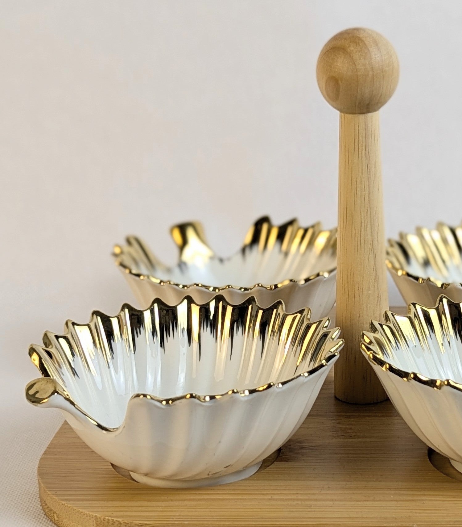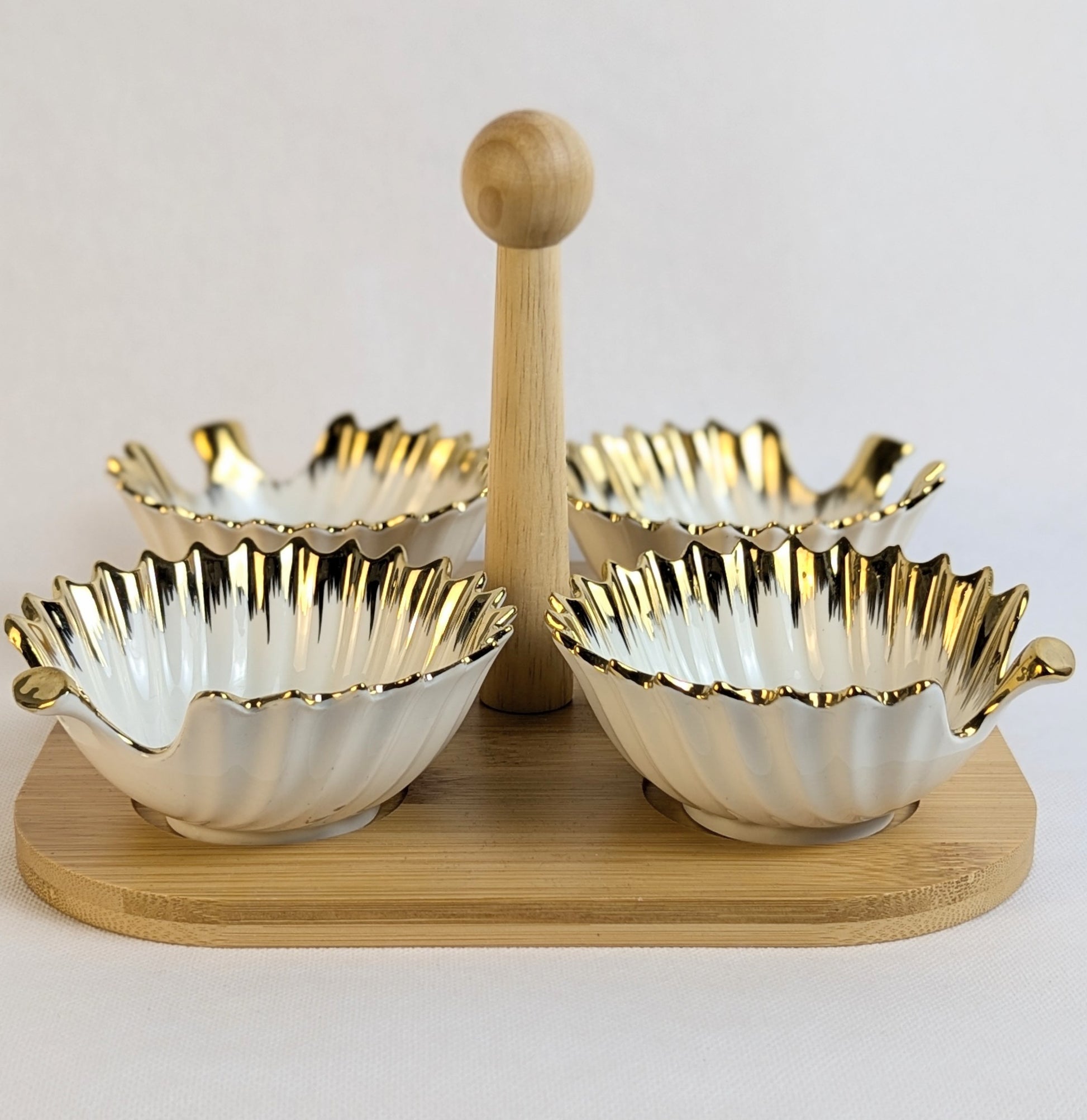 Découvrez notre élégant set apéritif 4 pièces en porcelaine avec liseré doré et support en bois. Parfait pour vos soirées, il ajoutera une touche de sophistication à votre table. Fabriqué en porcelaine de qualité, ce set apéritif est résistant et durable. Profitez d'un apéritif en toute élégance avec notre set 4 pièces.